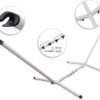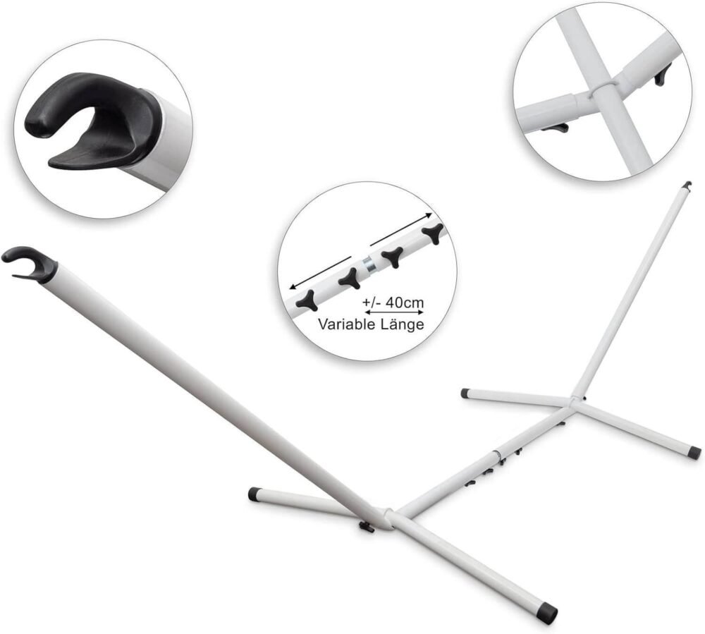 Technische Details: Das Hängemattengestell ist in der Länge von 300 – 340 cm verstellbar und eignet sich für Hängematten mit einer Länge von 290 – 330 cm.