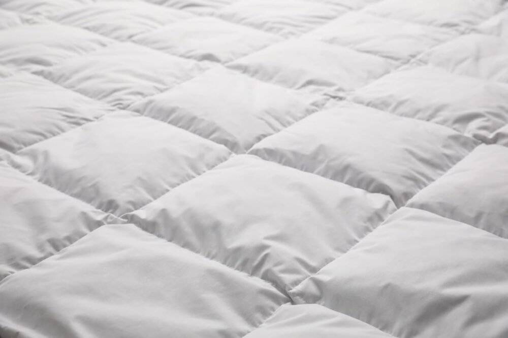 Die Decke ist mit einem Rautenmuster gesteppt, wodurch die Füllung gleichmäßig verteilt bleibt und Kältebrücken vermieden werden.