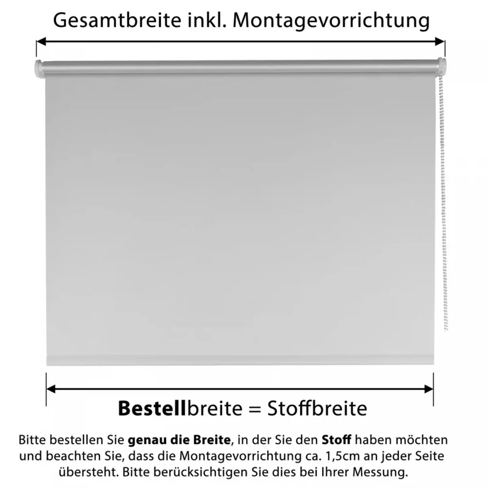 Bitte bestellen Sie genau die Breite, in der Sie den Stoff haben möchten und beachten Sie, dass die Montagevorrichtung ca. 1,5cm an jeder Seite übersteht.