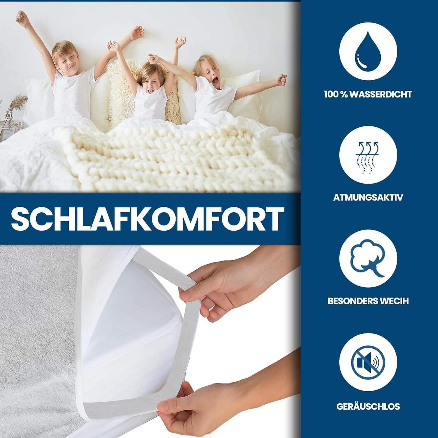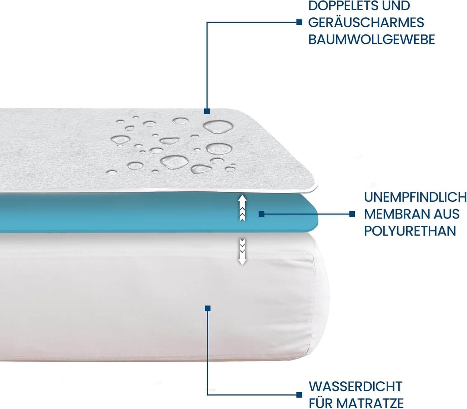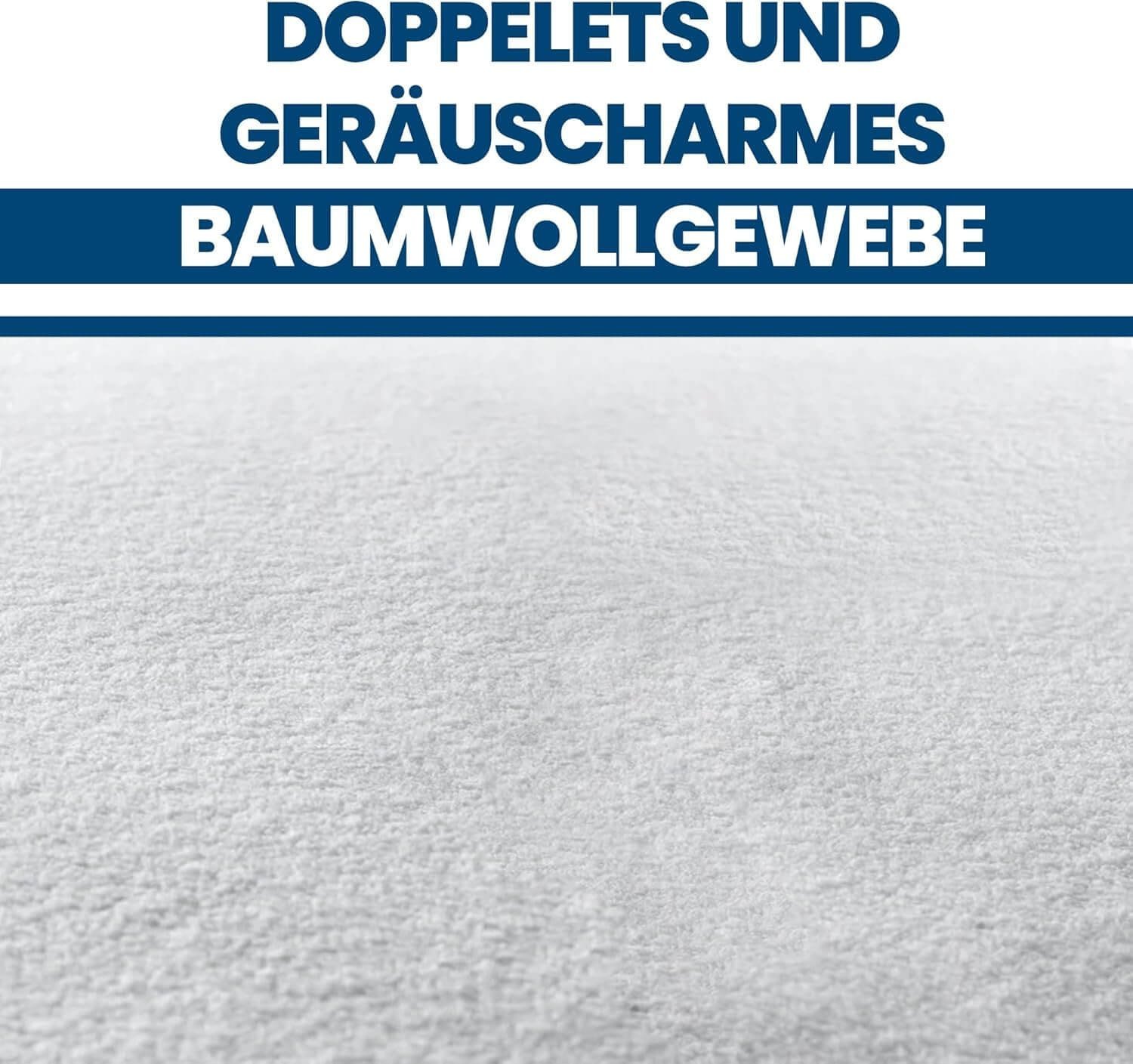 WEICH, GERÄUSCHARM & FLEXIBEL: Die glatte Oberfläche ist angenehm weich und leise im Gebrauch. Dank der elastischen Spannumrandung sitzt der Schoner perfekt auf Matratzen bis 30 cm Höhe – geeignet für Kaltschaum-, Latex- und Federkernmatratzen.